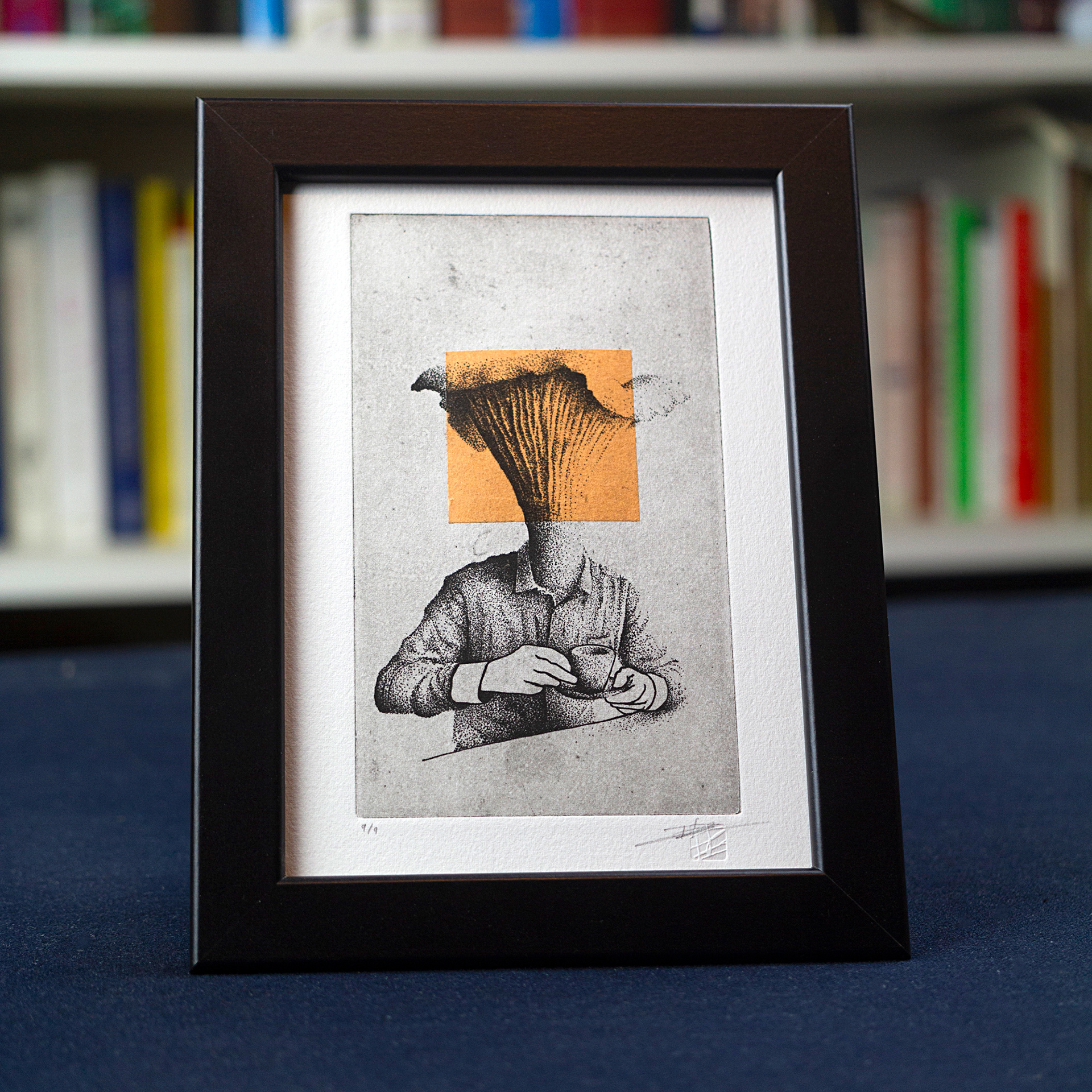 • Original etching from a limited edition of 10 fine art print max. Single photopolymer plate (Carbon Black AkuaInks) print on Vellum Arches BFK Rives 180gsm white paper (13 x 18 cm / 5.1 x 7 inches). The print measures 10 x 15 cm (3.9 x 5.9 inches). Color additions are created using the chine-collé technique and Awagami Mingeishi 48grm papers Or Awagami Okawara Select 51grm cream-coloured.
